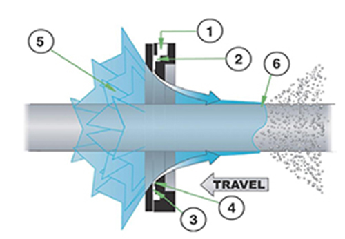 壓縮空氣經(jīng)入口(1) 進(jìn)入環(huán)型腔(2),然后經(jīng)由環(huán)形噴嘴(3) 得到一個(gè)高速環(huán)流。氣流沿著側(cè)壁(4) 高速噴出,這股氣流順著空氣環(huán)側(cè)壁以一個(gè)斜角噴射。這樣在空氣環(huán)一側(cè)的中心位置就會產(chǎn)生一個(gè)低壓區(qū)域(5),這個(gè)低壓區(qū)域就會迫使周圍大量空氣同高壓瀉出的氣流一道流向空氣環(huán)的另一側(cè)。當(dāng)氣流離開空氣環(huán)時(shí),產(chǎn)生一個(gè)360°圓錐形圓環(huán)氣流,這股均勻強(qiáng)大的氣流就可以持續(xù)穩(wěn)定的吹除通過空氣環(huán)的材料(6)上的污物、水等雜質(zhì)。