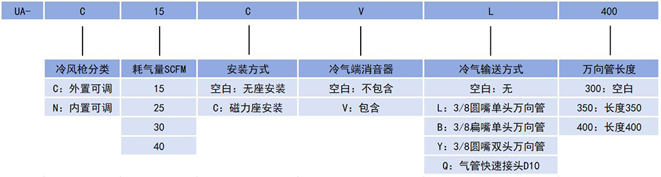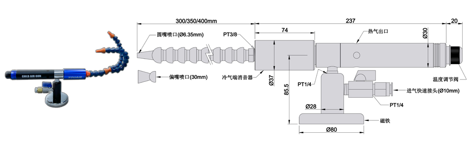 YOUAIR可調(diào)式冷卻槍利用渦旋管將普通壓縮空氣變成冷熱兩股低壓氣流。熱氣流經(jīng)抑制器反射,部分從熱氣出口3排出。冷氣流從萬向軟管4排出,該柔軟管即直接指向需冷卻的部位,立即冷卻發(fā)熱部件。冷卻槍帶一個(gè)磁性基座5,非常易于??烧{(diào)式冷卻槍設(shè)置有溫度控制閥旋鈕2,旋鈕逆時(shí)針旋轉(zhuǎn)時(shí)調(diào)低冷空氣溫度,此時(shí)冷氣溫度會(huì)降低,冷空氣流量會(huì)減少,順時(shí)針轉(zhuǎn)動(dòng)旋鈕冷氣溫度會(huì)升高,流量會(huì)變大。