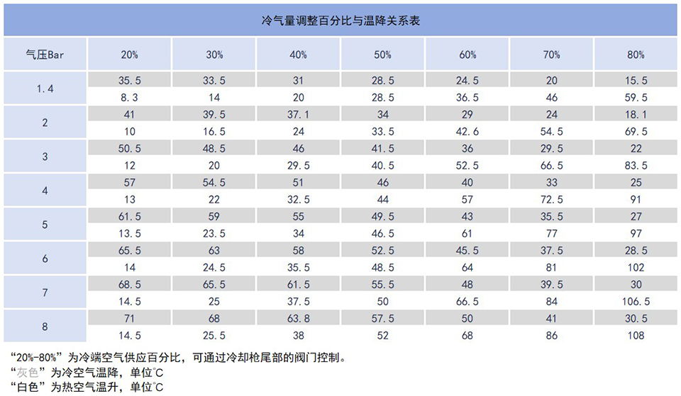 YOUAIR可調(diào)式冷卻槍利用渦旋管將普通壓縮空氣變成冷熱兩股低壓氣流。熱氣流經(jīng)抑制器反射,部分從熱氣出口3排出。冷氣流從萬(wàn)向軟管4排出,該柔軟管即直接指向需冷卻的部位,立即冷卻發(fā)熱部件。冷卻槍帶一個(gè)磁性基座5,非常易于??烧{(diào)式冷卻槍設(shè)置有溫度控制閥旋鈕2,旋鈕逆時(shí)針旋轉(zhuǎn)時(shí)調(diào)低冷空氣溫度,此時(shí)冷氣溫度會(huì)降低,冷空氣流量會(huì)減少,順時(shí)針轉(zhuǎn)動(dòng)旋鈕冷氣溫度會(huì)升高,流量會(huì)變大。