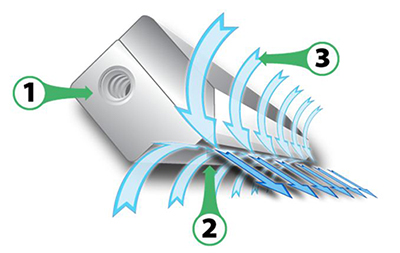 壓縮空氣經(jīng)進(jìn)氣口(1) 進(jìn)入氣刀高壓腔,氣流通過狹窄,細(xì)薄的噴嘴(2) 后在氣刀長度方向就形成一張均衡的氣流薄片。由于腔室(3) 對高壓氣流的壓縮比為40:1,使得氣流速度損失最小,而壓力更大,于是就產(chǎn)生一張具有強(qiáng)沖擊力而最小剪切力的氣流薄片。