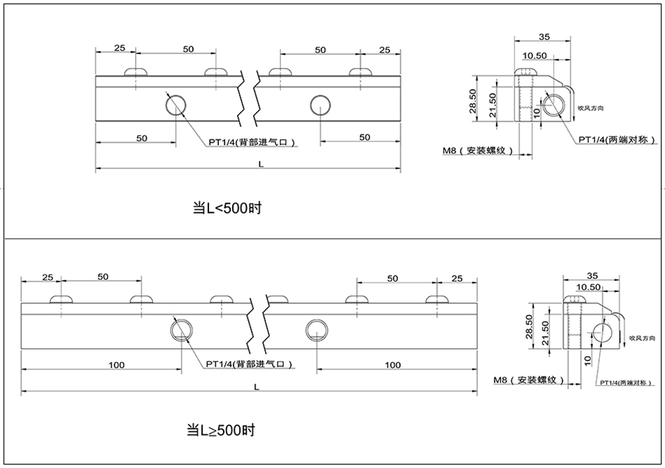 鋁: 鋁制超級氣刀適用于不存在腐蝕或污染因素的各種環(huán)境。帶塑料墊片的航空級鋁結(jié)構(gòu)非常耐用,適用于一般用途。使用的不銹鋼螺釘耐腐蝕。它內(nèi)部墊片可以承受高達(dá) 82°C 的溫度。如需承受更高的溫度,出氣間隙可以直接加工在氣刀上面,采用無墊片形式,可耐150°C高溫。